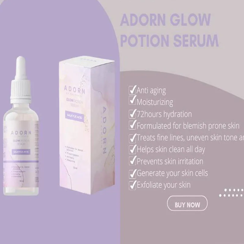lluminate your skin with Adorn Glow Potion Serum, a powerful brightening serum formulated to enhance radiance and improve overall skin texture. Enriched with potent active ingredients, it helps reduce dark spots, fine lines, and dullness while deeply hydrating the skin. Lightweight and fast-absorbing, this serum leaves your skin glowing, smooth, and refreshed.