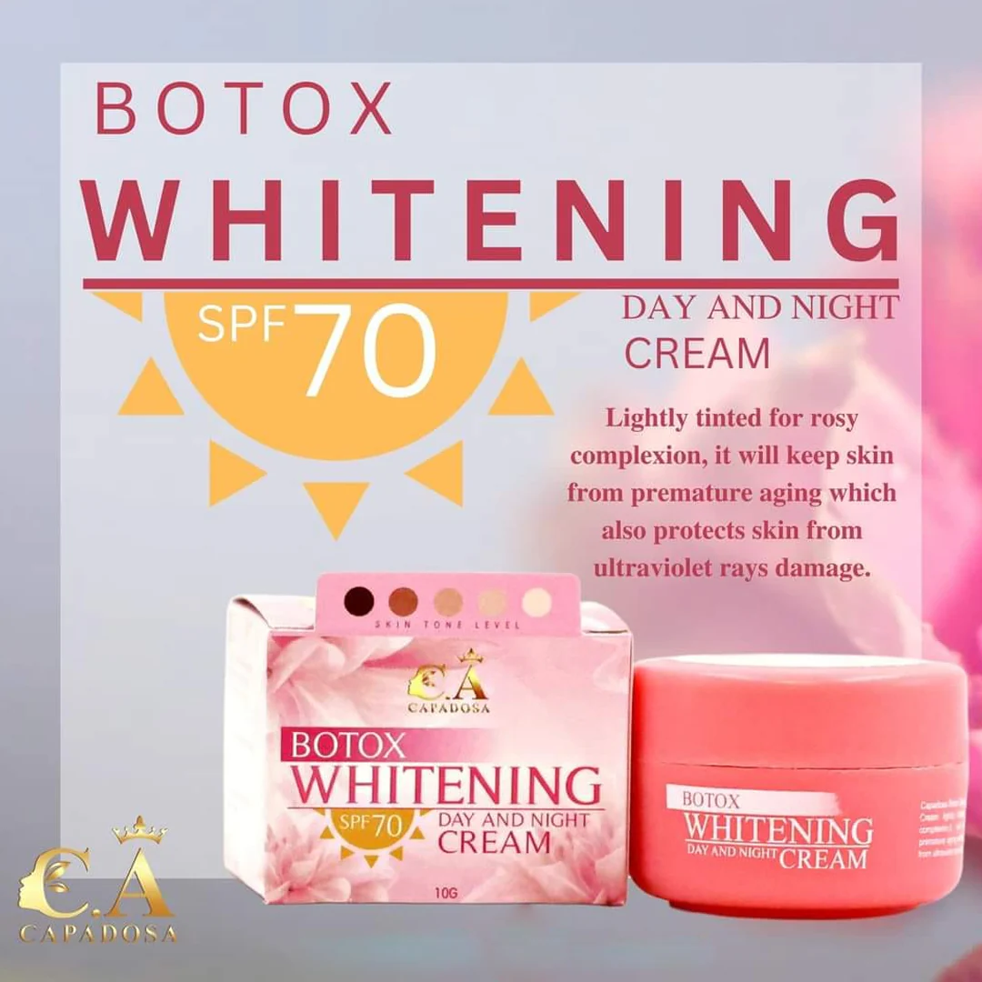 Botox Whitening Day & Night Cream (10g) is a lightweight and fast-absorbing skincare formula designed to brighten, smooth, and rejuvenate your skin. Enriched with whitening actives and anti-aging ingredients, it helps reduce dark spots, hyperpigmentation, melasma, and uneven skin tone.