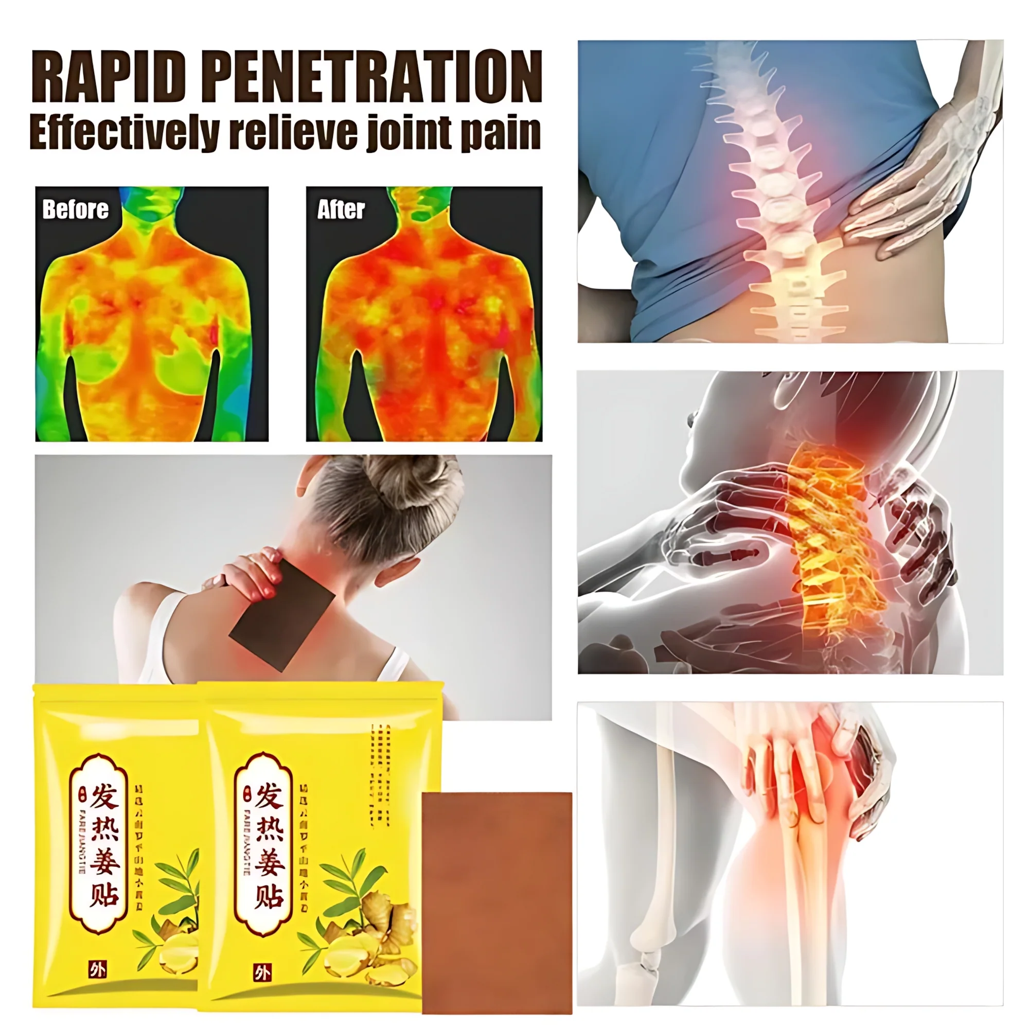FAREJIANGTIE Pain Relief Ginger Patches are natural herbal heating patches made with pure ginger extract, wormwood, and warming essential oils. These patches are specially designed to help relieve muscle pain, joint discomfort, stiffness, swelling, and fatigue by improving circulation and delivering soothing heat directly through the skin.