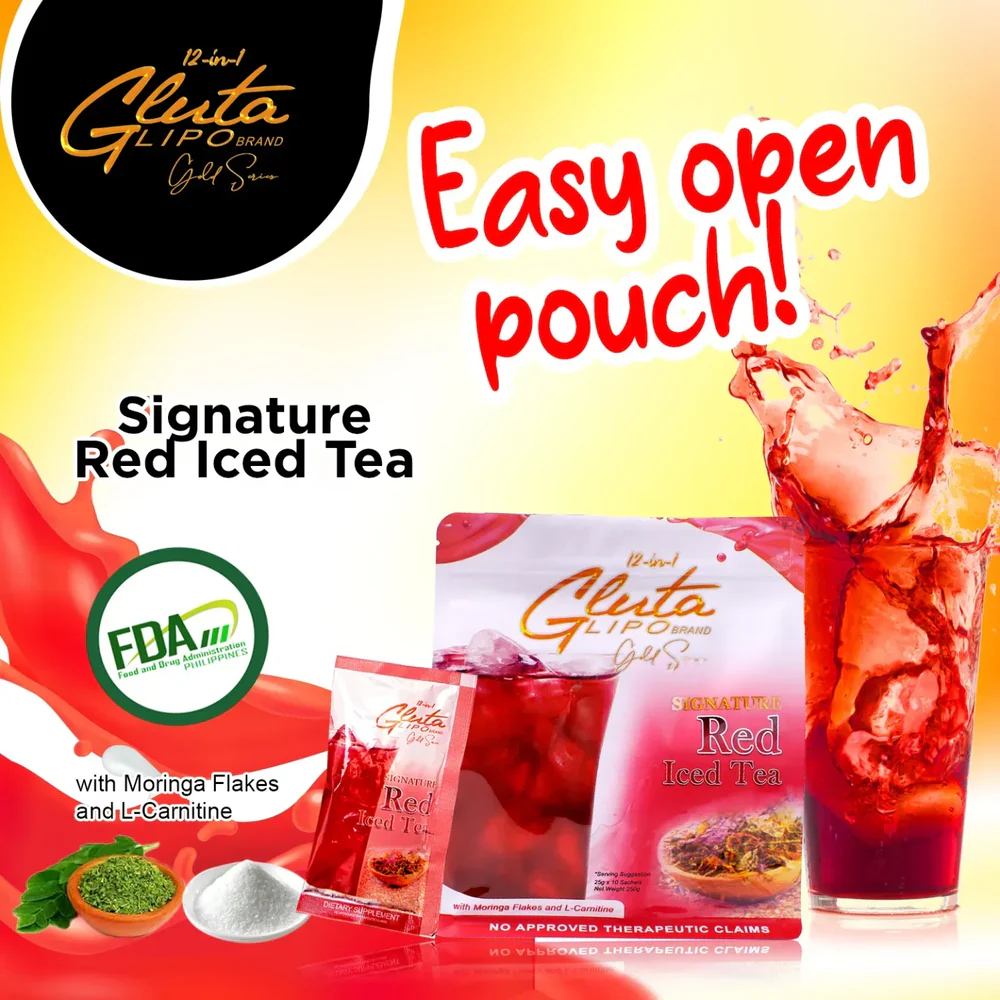 Gluta Lipo Red Iced Tea is a delicious slimming and detox drink specially formulated with Glutathione, L-Carnitine, Garcinia Cambogia, Collagen, and natural herbal extracts. This refreshing red iced tea supports weight loss, enhances skin whitening, and provides a gentle colon detox to remove toxins and bloating.