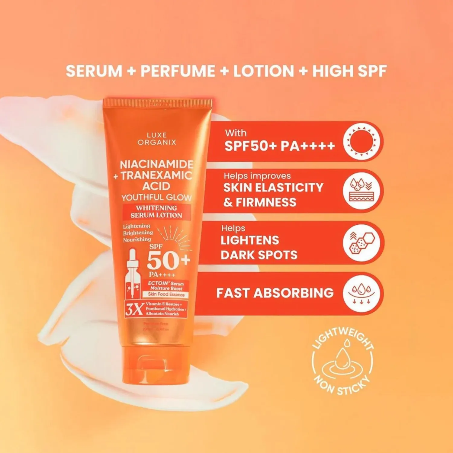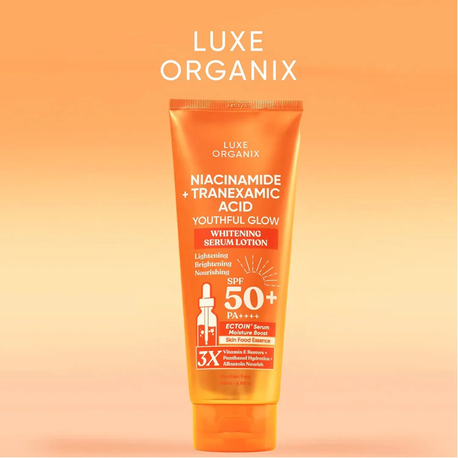 Luxe Organix Niacinamide + Tranexamic Acid Youthful Glow Whitening Serum Lotion SPF 50+ PA++++ – 200ml