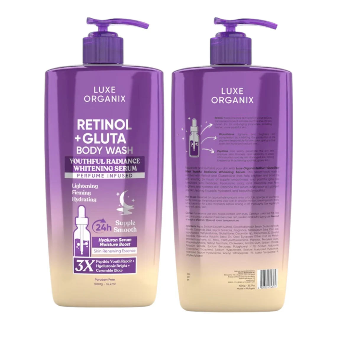 Luxe Organix Retinol + Gluta Youthful Radiance Body Wash is a perfume-infused whitening body wash enriched with Retinol and Glutathione. It gently cleanses the skin while helping to brighten and even out skin tone, leaving it soft, smooth, and radiant. The added perfume gives a long-lasting fresh scent, making your shower experience luxurious and refreshing. Ideal for daily use on all skin types.