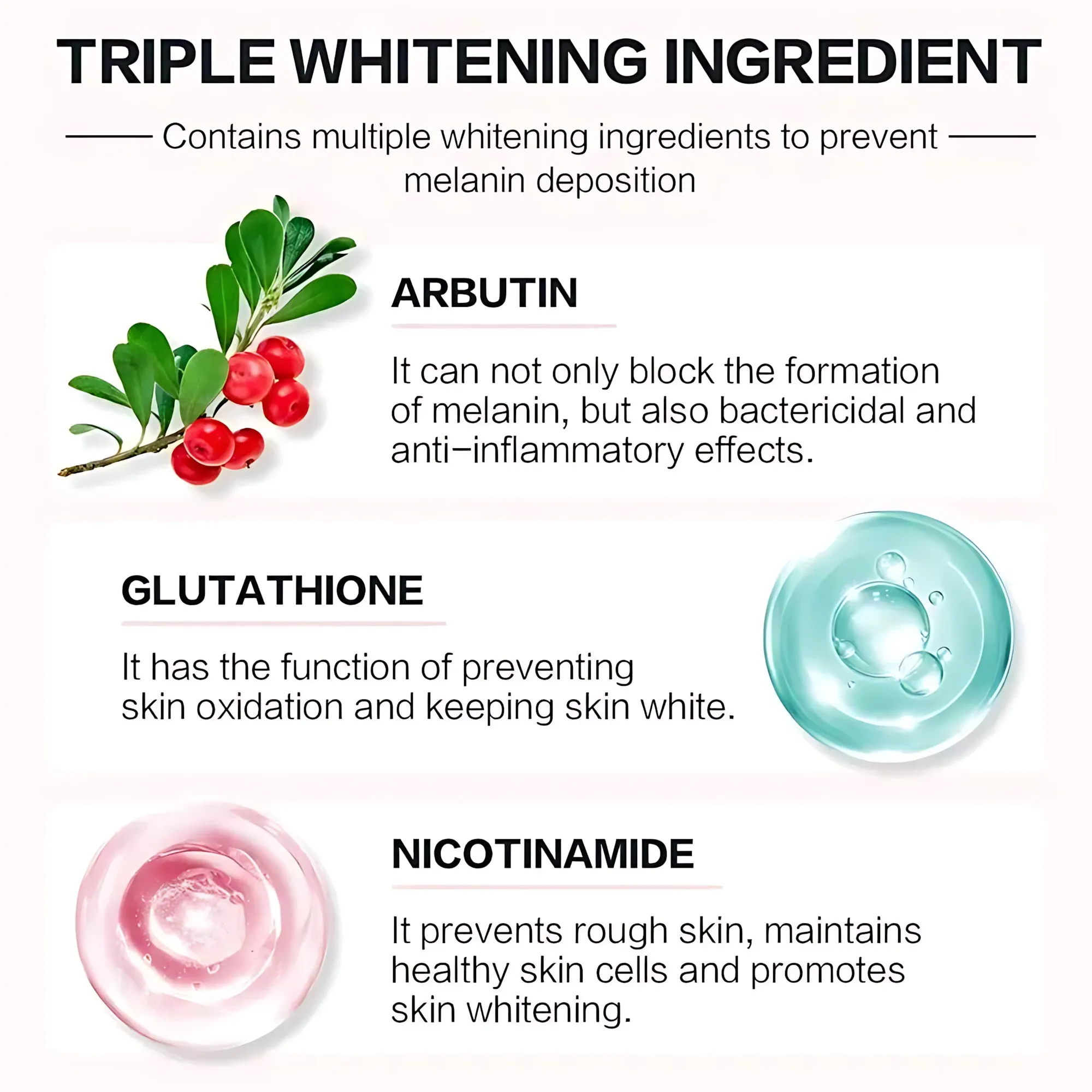 Arbutin: Inhibits melanin formation to reduce pigmentation and promote a more luminous complexion.
